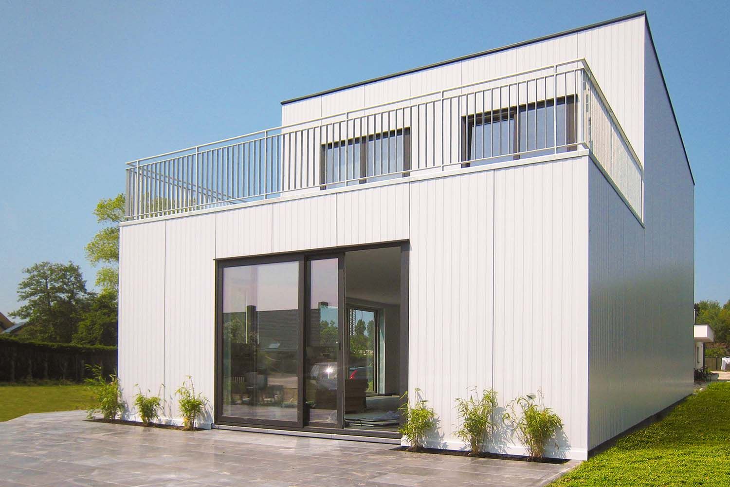 A partir de la dalle de sol, une structure en acier a été montée avec des profils sigma. Tant la structure de la toiture que l’étage intermédiaire sont constitués d’un steeldeck (hourdis profilés). Le revêtement de la structure en acier est composé de panneaux sandwich Joris Ide avec isolation PIR. Le panneau extérieur est en acier prélaqué (Colorcoat HPS200 Ultra® - couleur Albatross). Un élément unique de cette habitation réside dans l’intégration des fenêtres dans les panneaux par le biais du concept de la « window integration ».