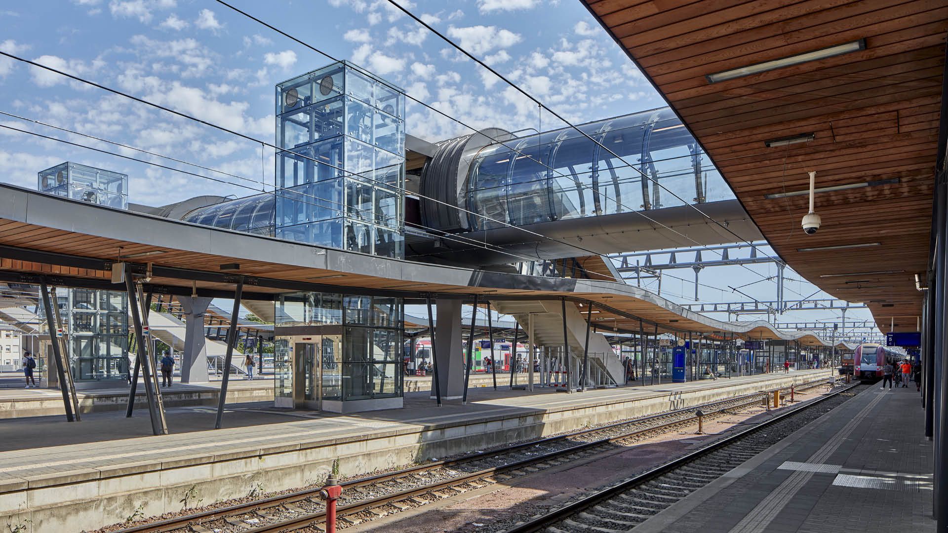 D’une largeur de passage de 4 mètres, d’un design beaucoup plus moderne et de forme ovale, un nouvelle passerelle garantit l’accès aux 6 quais de la gare tout en facilitant le passage des riverains entre les quartiers Gare et Bonnevoie.
