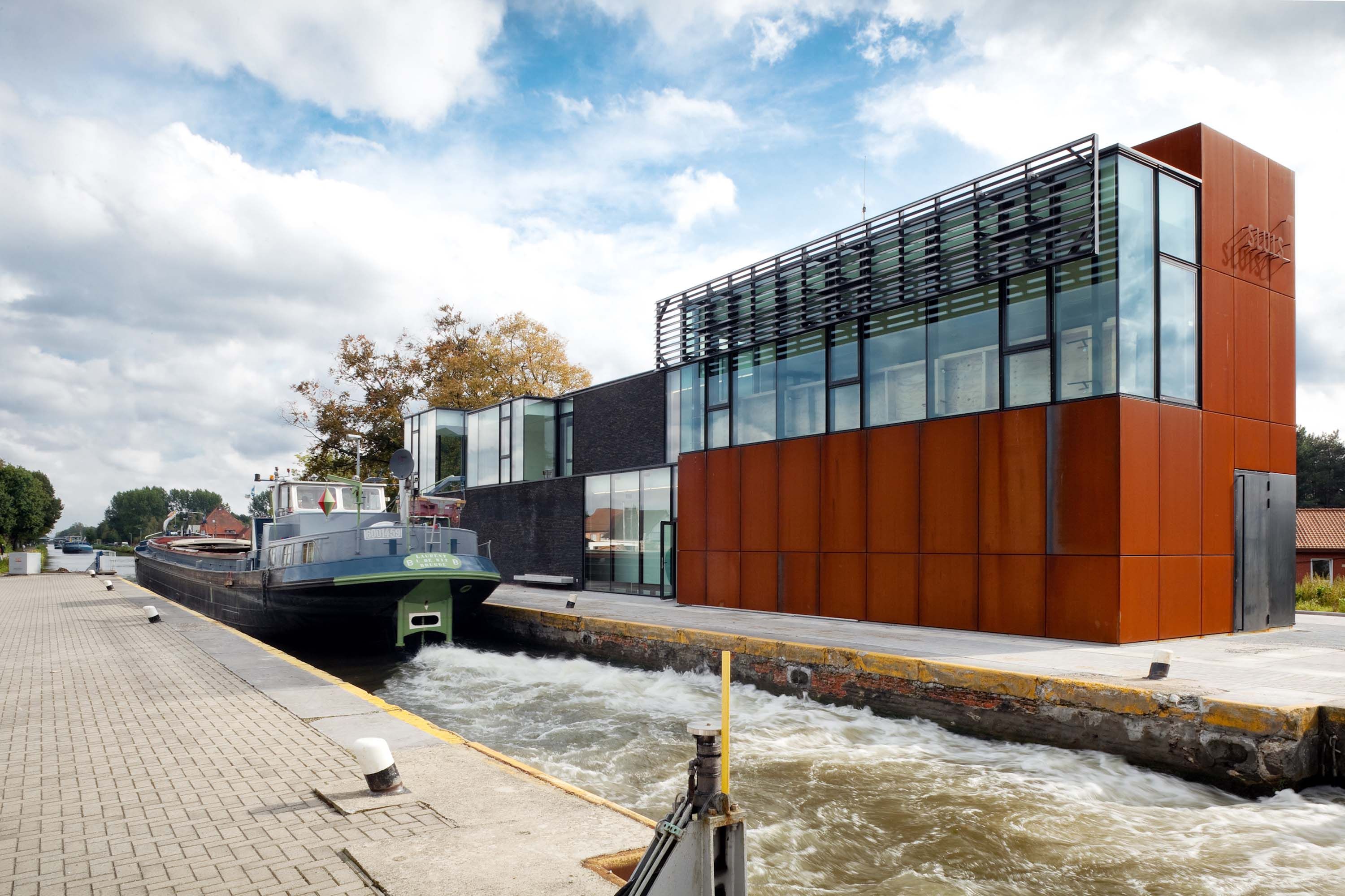 Depuis 2010, un nouveau bâtiment de contrôle central trône le long du canal Dessel-Turnhout-Schoten. À partir de ce nouveau complexe à Rijkevorsel, le personnel de la sociète De Scheep-vaart commande l’écluse n° 1 et les onze ponts qui enjambent le canal. Le bâtiment sobre, situé au niveau de l’écluse, mêle différentes fonctions et, malgré sa longueur, il a été conçu de manière assez compacte. Il est aménagé comme un bateau, avec un rez-de-chaussée fermé pour les fonctions techniques et un étage ouvert sur le canal.