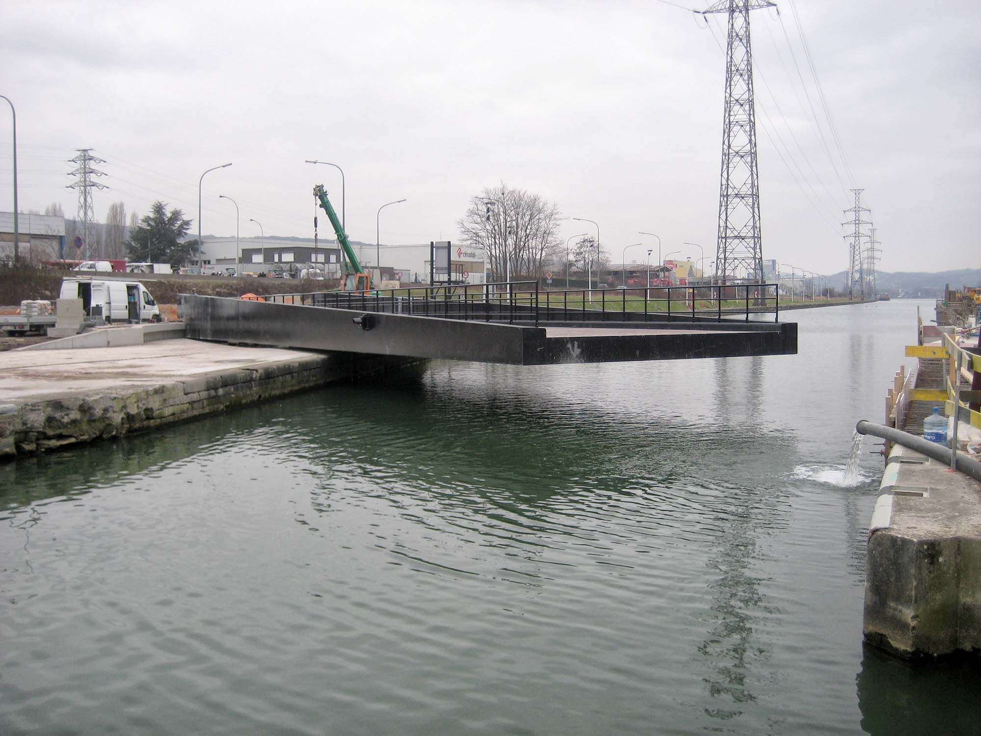 Dans le cadre de la construction d’une nouvelle écluse à grand gabarit au droit du Barrage d’Ivoz-Ramet (Meuse), il est apparu nécessaire d’implanter un pont routier vers l’îlot situé entre l’ancienne et la nouvelle écluse. Après analyse, le choix d’un pont mobile « au fil de l’eau » s’est imposé, pour le faible impact visuel qu’il générait, toutes les solutions fixes étant assorties de rampes d’accès importantes, liées au respect du gabarit fluvial.